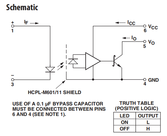 The HCPL-M600/01/11 optically coupled gates combine a GaAsP light emitting diode and an integrated high gain photon detector. The output of the detector I.C. is an Open-collector Schottky-clamped transistor.