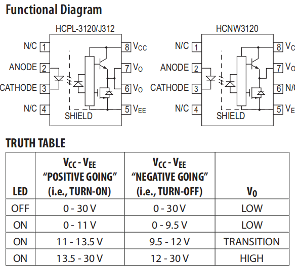 HCPL-3120 zawiera diodę GaAsP, natomiast HCPLJ312 i HCNW3120