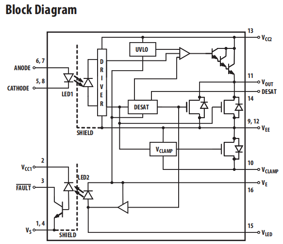 Optocoupler sterujący bramką IGBT o prądzie wyjściowym 2.5A z wbudowanym (VCE) wykrywaniem przesycenia, UVLO Sprzężenie zwrotne stanu błędu, aktywne tłumienie Millera i Auto-Reset błędów.